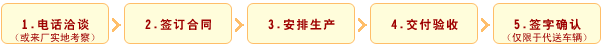 | 第一步:購(gòu)車洽談:通過電話聯(lián)系或?qū)嵉乜疾烨⒄勡囕v型號(hào)、價(jià)格和相關(guān)要求。 |