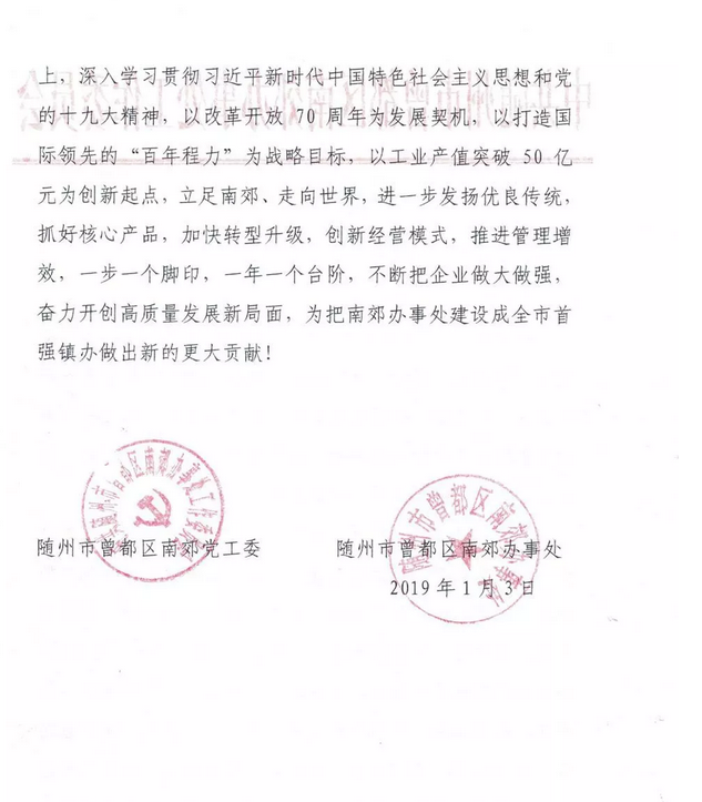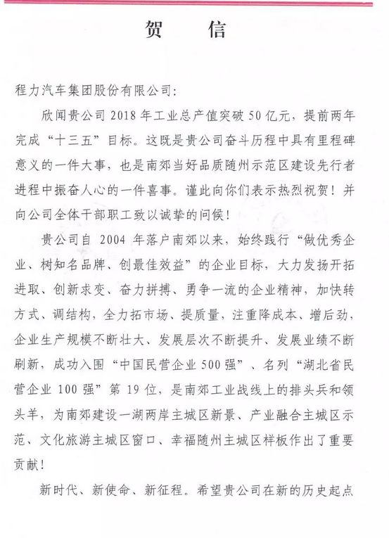 程力汽車集團股份有限公司2018年專汽產值突破50億,曾都區(qū)南郊黨工委南郊辦事處發(fā)賀信鼓勵