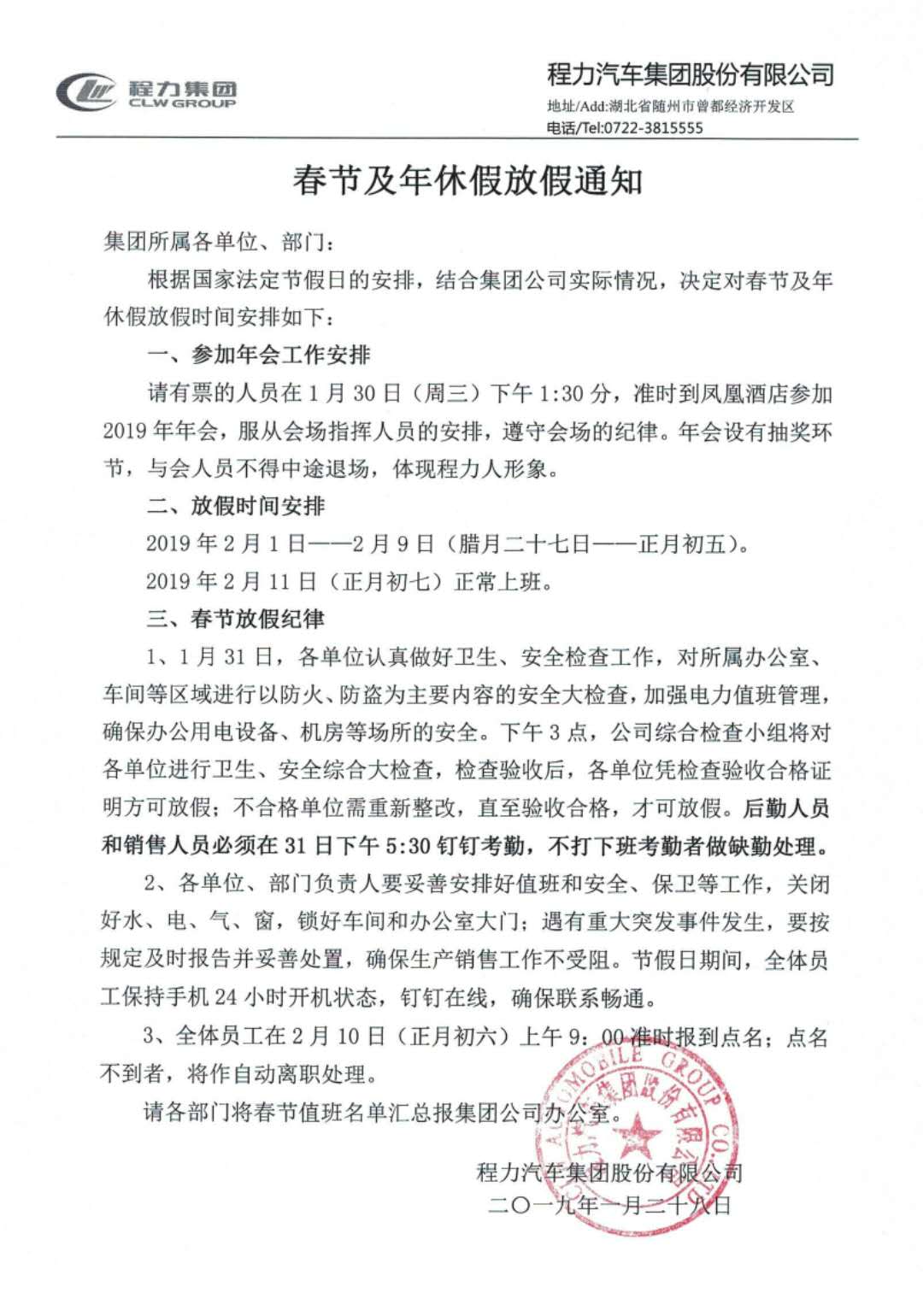 湖北程力集團(tuán)2019春節(jié)放假通知