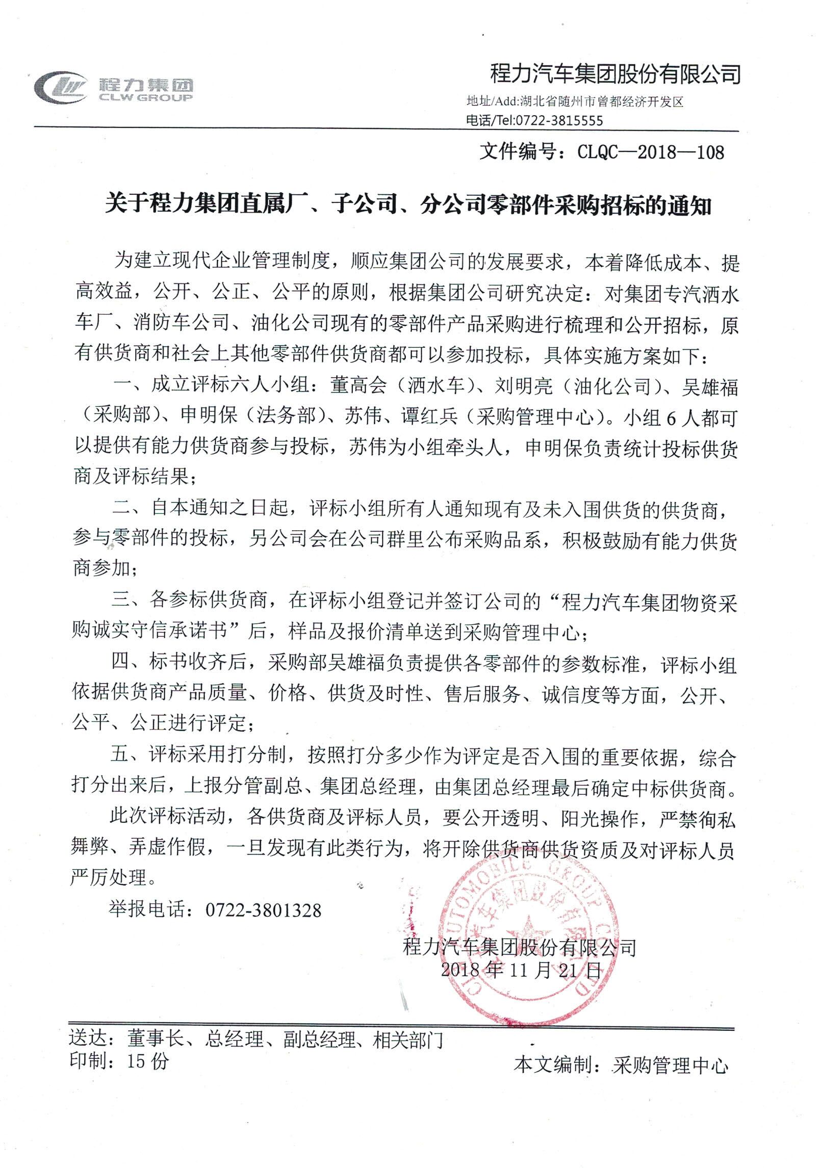 湖北程力公司正在進(jìn)行所有程力公司所用的所有零部件及配套件(含所有的灑水車、環(huán)衛(wèi)車、化工車、消防車、罐式車等)招投標(biāo)活動(dòng),我們需要供應(yīng)商或從事此方面的專業(yè)人員踴躍投標(biāo),公司對(duì)所有的供應(yīng)商一視同仁、不偏不倚,嚴(yán)格按照公開、公正、公平原則進(jìn)行招投標(biāo)工作,所有投標(biāo)人員只要性價(jià)比合理均有可能會(huì)中標(biāo),請(qǐng)公司各位員工積極介紹認(rèn)識(shí)的相關(guān)能配套的人員或公司投標(biāo)。