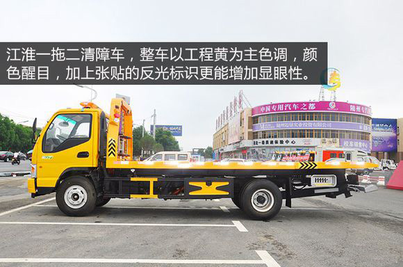 江淮平板一拖二清障車,整車以工程黃為主色調(diào),顏色醒目,加上張貼的反光標(biāo)識更能增加顯眼性,(如圖,在閃光燈的拍攝下反光出的效果)即使在北方冬季大雪的情況下,也能顯示出顯眼性,充分的保障了行車的安全性。