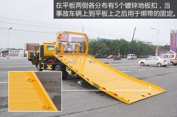 在平板兩側(cè)各分布有5個鍍鋅地板扣,當(dāng)事故車輛上到平板上之后用于綁帶的固定。