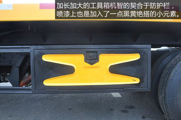 加長加大的工具箱機智的契合于防護(hù)欄,噴漆上也是加入了一點黑黃絕搭的小元素,絲毫不顯突兀,完美的融入整車色調(diào)。