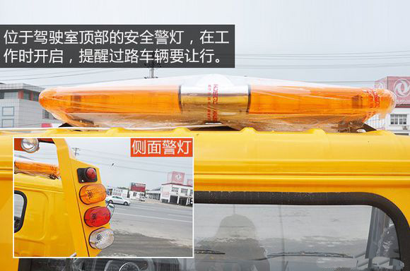 位于駕駛室頂部的安全警燈,在工作時開啟,提醒過路車輛要讓行,另外平板上方的架子左右各加裝有長排24V電子安全警示燈,進(jìn)一步的加強了安全性。