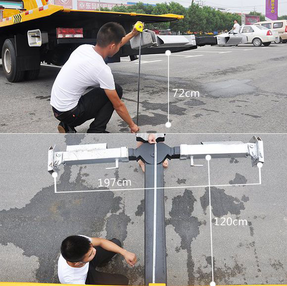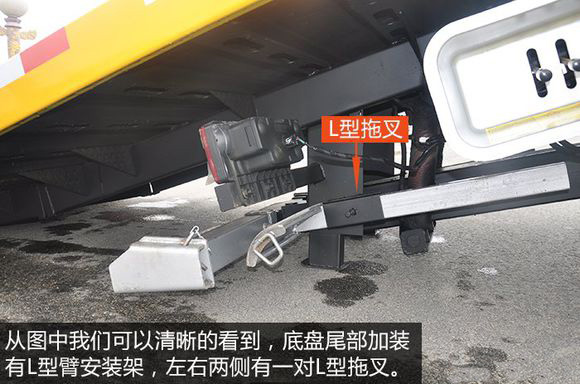 從圖中我們可以清晰的看到,底盤尾部加裝有L型臂安裝架,左右兩側(cè)有一對L型拖叉,其作用主要是托舉車輛時,能抱緊輪胎,防止輪胎滑落。