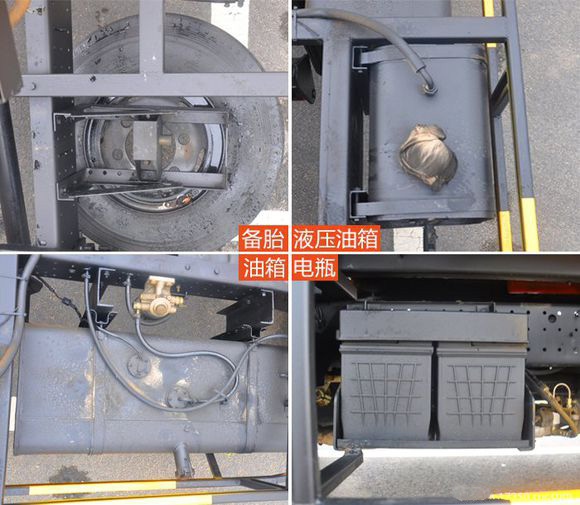 我們再來看看底盤上各零部件的分配,電瓶置于駕駛室左后方,與之對應(yīng)的右后方是油箱,油箱后方則是液壓油箱,緊隨其后的就是備胎。各零部件在不影響美觀的前提下,分配合理,實用性也很強。