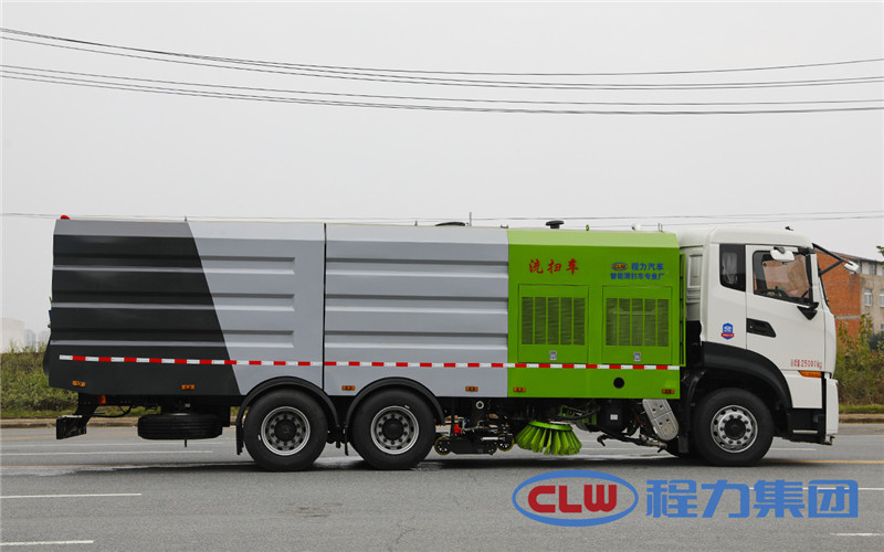 東風(fēng)天龍洗掃車副發(fā)動機驅(qū)動風(fēng)機和高壓水泵,副發(fā)動機采用東風(fēng)康明期6缸柴油發(fā)動機。 風(fēng)機用8.0高壓離心風(fēng)機,效率高、風(fēng)量大,最高風(fēng)量達(dá)23500m3/h。 東風(fēng)天龍洗掃車高壓水泵采用同際知名T7012IR 型柱塞柱,流量合適,壓力高,允許最高壓力達(dá)10MPa,清水箱充分利用了車載空間,容積大,容積達(dá)12m3。 東風(fēng)天龍洗掃車?yán)洳捎脝螌硬讳P鋼結(jié)構(gòu),傾翻卸料,帶高壓位自潔裝置。自潔裝置可在垃圾箱卸料時幫助卸料,清洗垃圾箱內(nèi)部。 東風(fēng)天龍洗掃車左右立掃為單掃盤,減少了掃刷數(shù)量和掃刷消耗量,能降低使用成本。左右立掃分開控制,可實現(xiàn)左掃、右掃和全掃等不同作業(yè)模式。寬吸嘴的吸口寬度達(dá)到2418mm,確保作業(yè)總寬度大于3.5mm。 湖北程力國六東風(fēng)天龍后雙橋大型洗掃4個高度可調(diào)的吸嘴輪,能方面調(diào)整和保證吸嘴與路面間的合理間隙。吸嘴內(nèi)高有噴水桿,盡可能多地將高壓洗滌噴嘴布置在吸嘴內(nèi)部,不但清洗效果好,還能最大限度減少高壓水氣流沖起污物產(chǎn)生的二次污染。左右噴水桿安裝在吸嘴上,隨吸嘴升降,結(jié)構(gòu)簡單緊湊,保證噴水桿的離地高度固定不變,達(dá)到最佳清洗效果。 東風(fēng)天龍洗掃車開式液壓系統(tǒng)驅(qū)動左右立掃升降、左右掃肋旋轉(zhuǎn)、吸嘴升降、垃圾箱后門開閉、垃圾箱傾翻復(fù)位等機械動作。底盤變速箱側(cè)取力器驅(qū)動低壓水泵,實現(xiàn)灑水車的低壓沖洗功能。一鍵式作業(yè)起動和停機操作。 東風(fēng)天龍大型洗掃車具有路面清洗、路面清掃、路緣清洗、路緣和路緣石立面洗刷、低壓沖洗、噴霧除塵等多功能。有“全洗掃”、 “左洗掃”、 “右洗掃”、 “全掃”、 “左掃”、 “右掃”6種作業(yè)模式可選擇。選擇“全洗掃”模式清洗廣場和路面,清洗效率高效果好,洗凈率達(dá)90%以上。選擇“左洗掃”或“右洗掃”模式清洗路面和路緣、洗刷路緣石立面。需要進(jìn)行路面清掃或路面保潔作業(yè)時,可選擇掃路模式。需要噴霧除塵時,可開啟噴霧裝置,進(jìn)行噴霧除塵作業(yè)。可以像灑水車一樣對路面進(jìn)行低壓沖洗作業(yè)。 東風(fēng)天龍大型洗掃車適用于城市道路、高速公路、廣場、機場、碼頭、遂道、橋梁、隔離墻避、路緣和路緣石立面的機械化清洗、清掃、噴霧降塵等清潔作業(yè)。