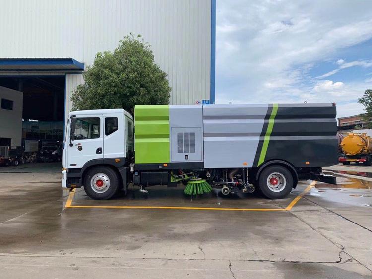 湖北程力東風(fēng)D9洗掃車(國(guó)六) 底盤配置: 采用東風(fēng)D9系列新款駕駛室,3950mm軸距,搭載國(guó)六(國(guó)VI)玉柴200馬力柴油發(fā)動(dòng)機(jī)/康明斯210匹馬力柴油發(fā)動(dòng)機(jī),6檔變速箱,9T后橋,295真空胎,方向助力、斷氣剎、電動(dòng)窗、中控鎖、ABS,原裝空調(diào),GB7258新規(guī)。 湖北程力東風(fēng)D9洗掃車(國(guó)六)上裝配置: 帶2個(gè)中置掃盤;中置超寬吸嘴;雙層吸塵筒; 康明斯170馬力副發(fā)動(dòng)機(jī);臺(tái)灣液壓閥;大力馬達(dá);德國(guó)高壓水泵 (前沖/側(cè)噴/中噴/后噴霧)/側(cè)沖洗水槍/垃圾箱自潔裝置); 萬(wàn)向高壓路沿清洗;威龍低壓泵(前沖),氣動(dòng)球閥控制; 4mm不銹鋼垃圾箱;不銹鋼水箱;德國(guó)控制器;尾部箭頭燈; 機(jī)油、垃圾箱、水箱均帶防溢或低位報(bào)警裝置;倒車及洗掃狀態(tài)室內(nèi)監(jiān)視器; 多種語(yǔ)音提示;倒車自動(dòng)保護(hù)、防傾倒垃圾翻車保護(hù)、檢修安全保護(hù); 20m高壓沖洗卷盤;刷臂轉(zhuǎn)動(dòng)機(jī)構(gòu)使用德國(guó)進(jìn)口高新耐磨工程隔套,免打黃油; 冷彎無(wú)縫液壓油管;運(yùn)動(dòng)控制器一鍵電腦控制。洗掃寬度3.5m;吸入粒度p110mm。 湖北程力東風(fēng)D9洗掃車(國(guó)六)多方位圖片: