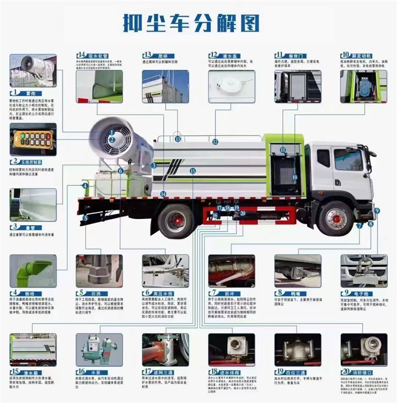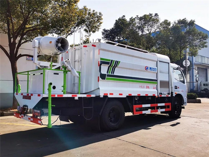 1、整車裝備、結(jié)構(gòu)緊湊、布局合理、部件做工精細(xì)、產(chǎn)品配置完善、操作性能好。 2、霧炮射程遠(yuǎn)、覆蓋面積大、霧粒細(xì)小、與飄起的塵埃接觸時(shí),形成一種潮濕霧狀體,能快速將塵埃抑制降沉。 3、適用范圍廣、工作效率高、可邊行駛邊噴霧、噴霧速度快、對(duì)塵埃有較強(qiáng)的穿透力和霧珠附著力、能有效地節(jié)約用水量和減少環(huán)境污染。 4、遙控/手動(dòng)兼容、起動(dòng)快捷、使用安全、靈活方便、性價(jià)比高。 5、微電機(jī)控制水平旋轉(zhuǎn),液壓馬達(dá)控制俯仰角度,交換角度速度快。 | 湖北程力國六多利卡8方抑塵車(方罐)程力威牌CLW5120TDYE6型多功能抑塵車圖片價(jià)格: